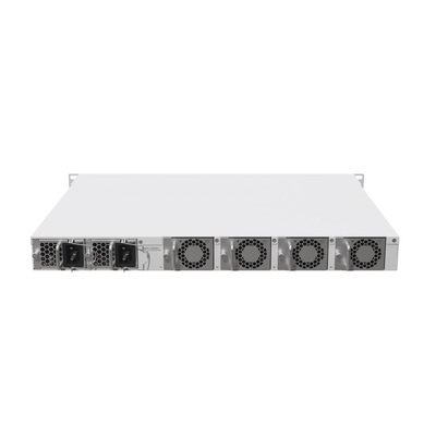 Hay 2 jaulas QSFP28 para una conectividad ultrarrápida de 100 Gigabit, 12 jaulas SFP28 para redes de 25 Gigabit y un puerto Gigabit Ethernet. El dispositivo viene con 16 GB de RAM, almacenamiento NAND decente y dos ranuras SATA M.2 para almacenamiento adicional. Hay cuatro ventiladores intercambiables en caliente, así como fuentes de alimentación intercambiables en caliente de doble redundancia. Y estas fuentes de alimentación podrían parecer familiares si ha usado nuestro CCR1072 antes: puede seguir usando sus fuentes de alimentación intercambiables en caliente anteriores y módulos SFP.