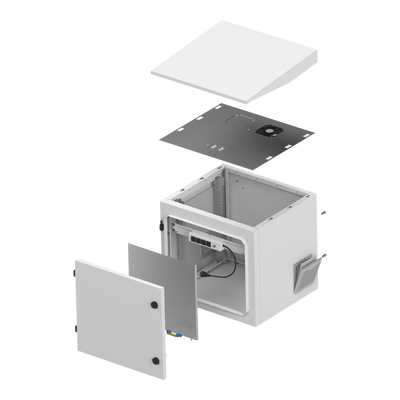 Gabinete para Exterior con Ventiladores y Termostato con Rack de 19' de 9 Unidades con capacidad de ser instalado en torre, poste o pared.