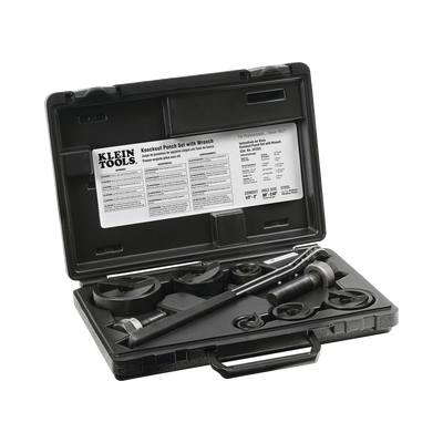 El juego de punzones incluye una llave de 25 mm (1'') con matraca, punzones sacabocados, matrices y pernos de tracción para los siguientes tamaños de tubos conduit: 13 mm (1/2''), 19 mm (3/4''), 25 mm (1''), 32 mm (1-1/4''), 38 mm (1-1/2'') y 51 mm (2'').