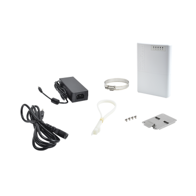 El PowerBox es un router para interperie de cinco puertos Ethernet, PoE en cuatro puertos. Se puede utilizar este dispositivo para suministrar energía a los cuatro dispositivos con capacidad PoE, tales como nuestro SXT u otros.