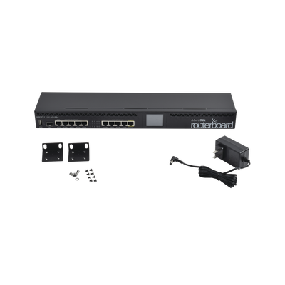 RouterBOARD 2011UiAS-RM, en comparación con la serie RB2011L, no solo tiene cinco puertos Gigabit LAN y cinco puertos Fast Ethernet LAN, sino también un puerto serie RJ45, puerto microUSB y más RAM (128 MB en lugar de 64 MB). Además, tiene licencia RouterOS L5 (en lugar de L4) y una pantalla LCD táctil agradable para la configuración. Un slot SFP (¡el módulo SFP no está incluido!)
