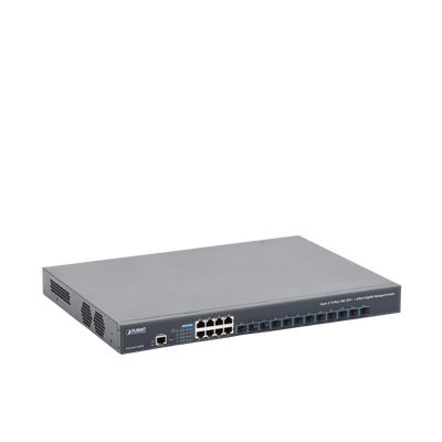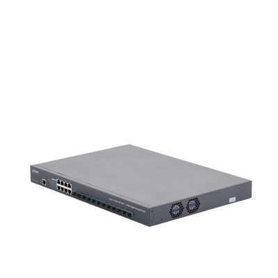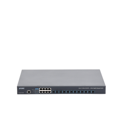 PLANET XGS-6350-12X8TR es un conmutador Gigabit gestionado de capa 3 que proporciona un rendimiento de alta densidad por su enrutamiento de 10 Gigabit de capa 3 con 12 interfaces de fibra SFP + y 8 interfaces Gigabit entregadas en un estuche resistente. El administrador puede elegir de manera flexible el transceptor SFP / SFP + adecuado de acuerdo con la distancia de transmisión o la velocidad de transmisión requerida para extender la red 10G de manera eficiente. Además, con una estructura de conmutación de 256 Gbps, el XGS-6350-12X8TR puede manejar cantidades extremadamente grandes de datos en una topología segura que se vincula a backbone o servidores de alta capacidad para empresas, centros de datos, campus, etc., donde aplicaciones de VoIP, transmisión de video y multidifusión son utilizados