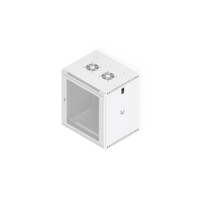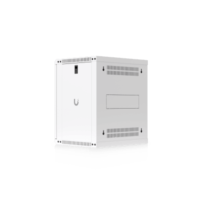 Gabinete para rack 12U de 4 postes para montaje en pared, tipo gabinete cerrado, con puerta frontal perforada y paneles laterales removibles y con llave.