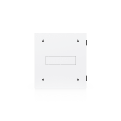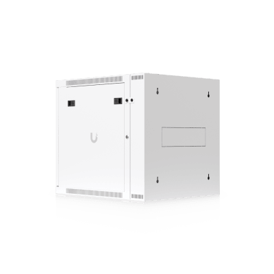 Gabinete para rack 12U de 4 postes, tipo gabinete cerrado para montaje en pared, con puerta frontal de vidrio templado, puerta trasera abatible (swing-out) y paneles laterales removibles y con llave.